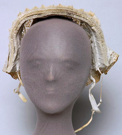 3 dakpansgewijze over elkaar liggende geplooide voorstroken. Onder de stroken een reep neteldoek, verstevigd met sutiƫn. Over de stroken een plat geplooid reepje neteldoek. De bodem bestaat uit aan elkaar genaaide stroken entre-deux en stroken machinale kant. In de hoek tussen voorstrook, bodem en onderrand van de muts een ingezet stukje van kant en entre-deux. Luifke van randen machinale kant en effen neteldoek. Onder aan de bodem 2 doorgeschoven bandjes. Striklintjes van veterband.