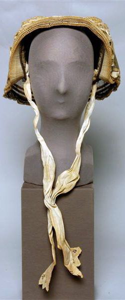 3 dakpansgewijze over elkaar liggende geplooide voorstroken van neteldoek. Over de voorstroken een ecru zijden riblint, in het midden gedraaid, aan beide zijden met lussen. Bodem en onderrand van witte katoene tule. Bodem versierd met 4 smalle fantasiebandjes tussen machinale kant. Op beide zijden van de bodem rugjes van in lussen gelegd en ingeknipt neteldoek (veertjes). Tussen de onderzijde van de rugjes een strik van ecru zijde met afhangende linten. Op de onderzijde van de tulen onderrand 3 fantasiebandjes en een machinaal kantje (bandjes en kant als op bodem). Het geheel is gemonteerd op stijf zwart gaas en is verstevigd met ijzerdraad en sutien. Striklinten van neteldoek eindigend in een strookje broderie.
