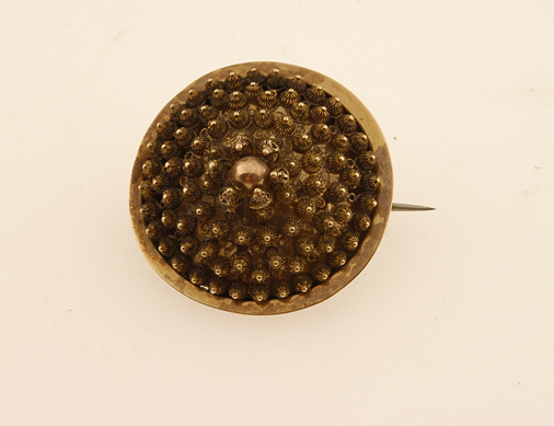 Ronde gouden broche met rand van cantiergoud. Gelijk van vorm als sloten van inv.nr. 8792 en 8796. Filigrainwerk (knopjes) aan bovenzijde. In het midden een glad, half bolletje.