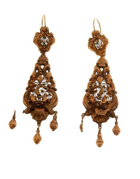 Lange hangers van gewalst, opengewerkt goud, met gladde achterkant, hol van binnen en versierd met filigrain en cantille