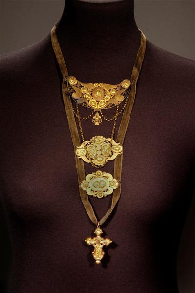 Bestaande uit schuif, grote en kleine walboot en klein hol gestampt kruisje. Platen bestaan uit plaatjes en filigrain. Aan bovenste plaat zijn jasseron kettinkjes bevestigd. Onderdelen onderling verbonden door donkerbruin fluweelband. Behorend bij inv.nr. 8812. Vgl. inv.nr. 8795 en ongenummerd.