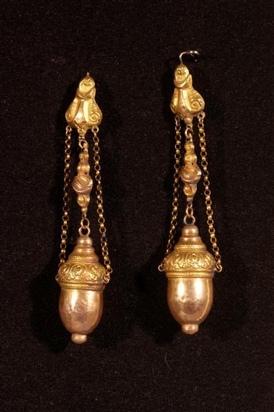 Bestaande uit 3 delen, verbonden met jasseronkettinkjes. Onderaan hangt een hol eikeltje. Behorend bij inv.nr. 8811.