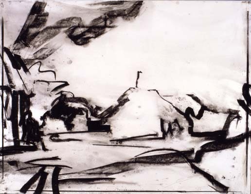 - BeschrijvingVirtuoos getekend als landschap te herkennen tafereel onder een stormachtige lucht. Behoort tot een serie parafrases op Rembrandts landschappen, genaamd "Remembrandt". Hiertoe behoort tevens een reeks portretten.