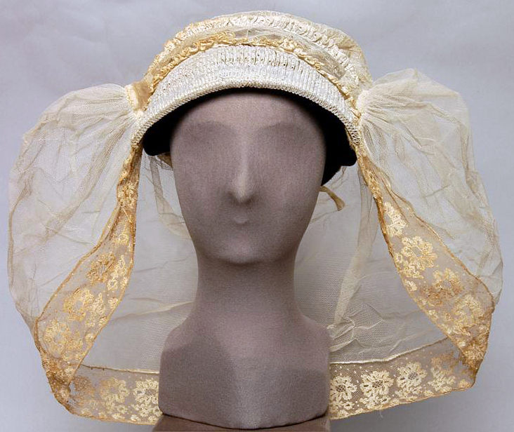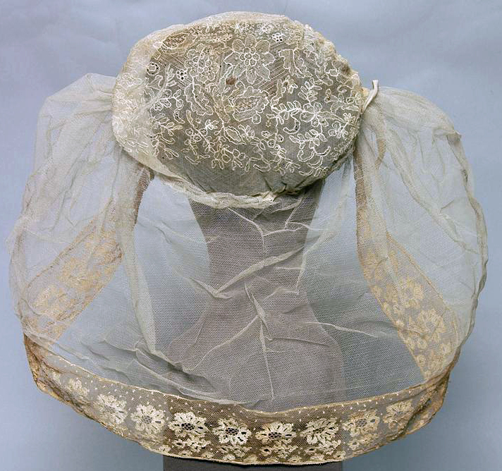 Muts: geplooide voorstrook van tule en kant. Kant aan de voorzijde verstevigd met een randje gaas en wit sutien doorlopend op de kant. 7 cm breed schildje van tule, de achterste helft versierd met een bloempatroon in doorstopwerk. In het midden een doorgestopte draad. Aan de voor- en achterzijde van het schildje een ruche van smal kant. Bodem van tule versierd met doorstopwerk in eenbloemig patroon. Geklost laddertje met 2 doorgeschoven katoenen bandjes. Tulen sluier met 6 cm brede kant ("Maaskantse"?). Zwart ondermutsje: 11 cm breed schildje van zwarte ribzijde (zijde?). Schildje gevoerd met zwarte keperkatoen tussenvoering van onbekende stof. Bodem van zwarte zijde. Door de zoom van de bodem zijn 2 zwarte katoenen bandjes geschoven. Bodem gevoerd met witte katoen (linnen?) genaaid op een stuk karton. De onderrand van de bodem is met grote steken op de onderrand van het karton vastgezet.