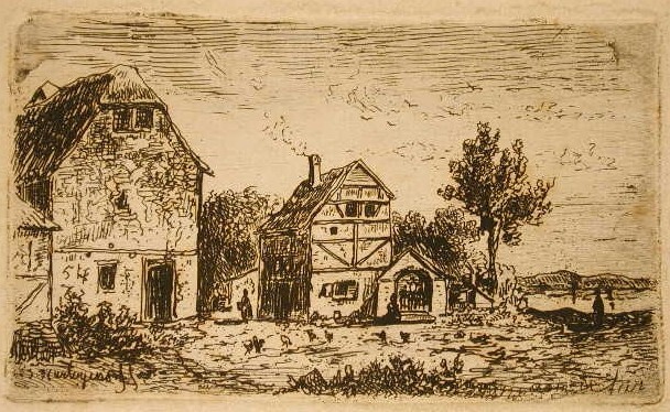 - BeschrijvingGezicht op enkele fachwerk-huizen, op de voorgrond een erf met enkele mensen en kippen. Rechtsachter een rivier en op de achtergrond een heuvelachtig landschap.