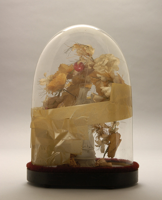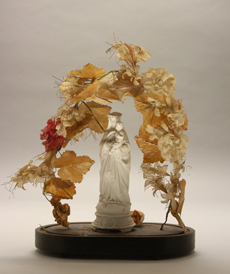- BeschrijvingHouten ovaal voetstuk met biscuitporseleinen Maria beeldje. Maria met bloemenkrans, kind op arm, staande op hemelsfeer met drie sterren, boven convexe band met monogram MA, ineen, in cartouche.