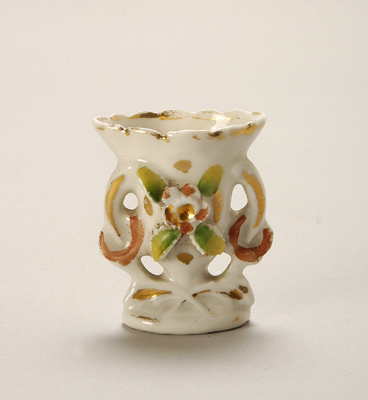 - BeschrijvingPorselein, met ruitvormige horizontale doorsnede, breder dan diep, naar boven kelkvormig uitlopend aan de voorzijde voorzien van een applique bloempje met blaadjes, goud, rood en groen beschilderd op wit. In de bodem een gaatje voor bevestiging.