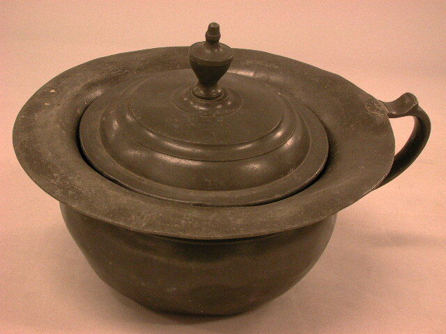 - BeschrijvingKamerpot, convex en concaaf, met brede rand en voluutvormig oor. Latere deksel met balustervormige knop.