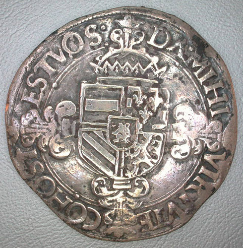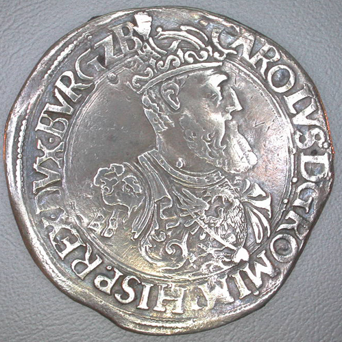 - BeschrijvingVz: binnen een getrokken rand het gekroonde borstbeeld van Karel V naar rechts; omschrift: CAROLVS:D:G:ROM:IMP:HISP.REX.DVX.BVRG.Z B, handje Kz: binnen een getrokken rand een gebloemd kruis, beladen met het Oostenrijks-Bour¬gon¬dische wapen; omschrift: DA.MIHI.VIRTVTE.CO.HOST.ES.TVOS