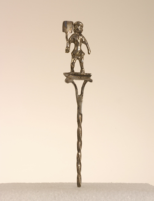 - BeschrijvingMet figuurtje van een landman, met in zijn rechterhand een opgeheven spa, op langwerpig standplaatje vierkante, gedraaide pin tussen standplaatje en pin een tussenstuk, bestaande uit een driehoekige opening.
