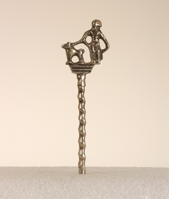 - BeschrijvingMet figuurtje van een man met een hond aan de lijn, op langwerpig, naar beneden smal toelopend, trapvormig standplaatje ronde gedraaide pin.