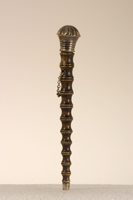 - BeschrijvingBenen pijpepeuter in wandelstokvorm; zilveren ronde, bolle dop en zilveren punt. Bovenzijde dop versierd met straalsgewijze inkepingen, de bruin geworden pin bestaat uit een aantal klosvormige onderdeeltjes (knerrenmotief). Iets onder de dop is een klein zilveren kettinkje bevestigd.