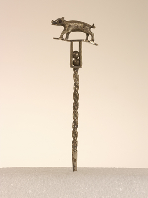 - BeschrijvingMet varkentje op langwerpig, onregelmatig gevormd standplaatje.De ronde, gedraaide pin, bestaande uit een gladde band en twee spiraaldraden, eindigt in een gladde punt. Tussen standplaatje en pin een tussenstuk, bestaande uit vier spiraalkolommetjes met twee losliggende balletjes ertussen.