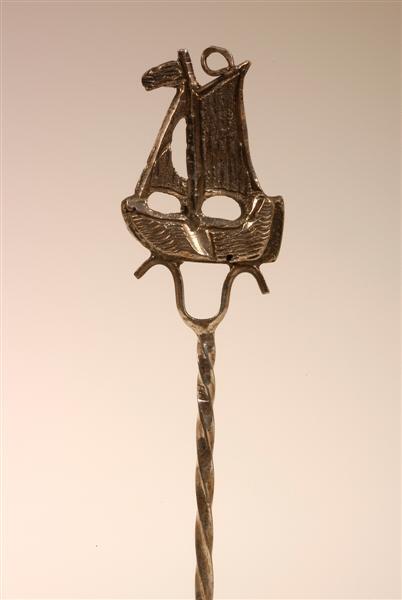 - BeschrijvingPijpewroeter met een vierkante geheel gedraaide en gevorkte pin. De tanden van de vork zijn omgebogen. Direct daarop zonder tussenstuk of standplaatje een zeilboot met twee zeilen.