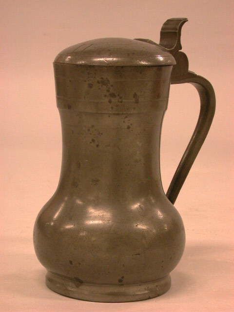 - BeschrijvingKan met klapdeksel met dubbelkakig scharnier aan de handgreep bevestigd. Omgekeerd balustervormig lichaam met smalle concave voet. De hals is omgekeerd conisch, het deksel gewelfd. De rust is S-vormig. Het oor is lintvormig. Op deksel ingekrast twee streepjes. In de kraag een maatnok.