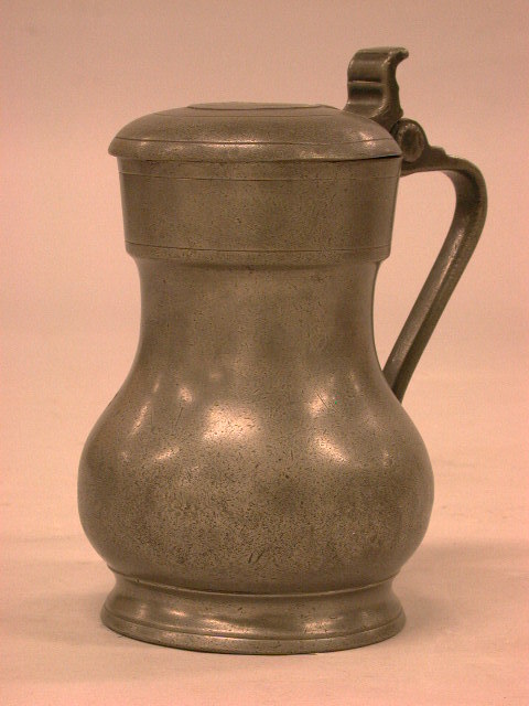De tinnen maatkan behoort tot het "Rotterdams type". Op lage standring de korte, laag ingesnoerde, gebolde en holle buik met iets uitlopende brede kraag. Daarop een flauw gebold deksel wat met de duim is bevestigd aan een tweekakig scharnier op de handgreep. Op de deksel het ijkcijfer 20 (=1720?) in de rand de cijfers 5, 8, 9 (= 1705, 1708, 1708?). In de deksel nog de gekraste initialen IvI en onder in de bodem KV(S)I en AL (vaag). In de deksel in witte verf het cijfer 15.