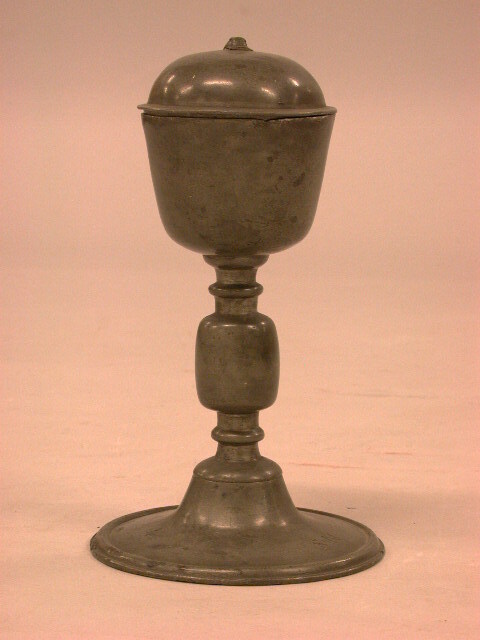 Vlaams. Kleine ciborie, kelkvormig met deksel. Op platte ronde voet met eenvoudige profielrand is de stam gesoldeerd die een grote nodus en 2 kleine knopen heeft daarop de eenvoudige cuppa met aan de binnenzijde verdunde bovenrand. In deze rand past de gladde, enigszins bolle deksel die een vlak randje heeft en in het midden een rechthoekig knopje, waarop oorspronkelijk ongetwijfeld een kruisje stond. In de bovenzijde van de voet gegraveerd: N S, vermoedelijk voor 'Notre Seigneur'. Onder de voet en in de deksel in witte verf het cijfer 53.