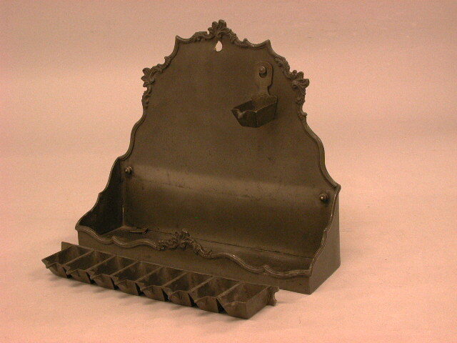 - BeschrijvingJoodse Chanouka lamp, uitgevoerd in gegoten tin, Lodewijk XV stijl. Grote bak met daarin los, hangend tegen de rug: - een eenpits olielampje (diener) en een achtpits olielampje. De contouren van de grote bak zijn versierd in Lodewijk XV ornamentiek. Behalve het inv.nr. ook op de drie losse delen in witte verf het cijfer 93.