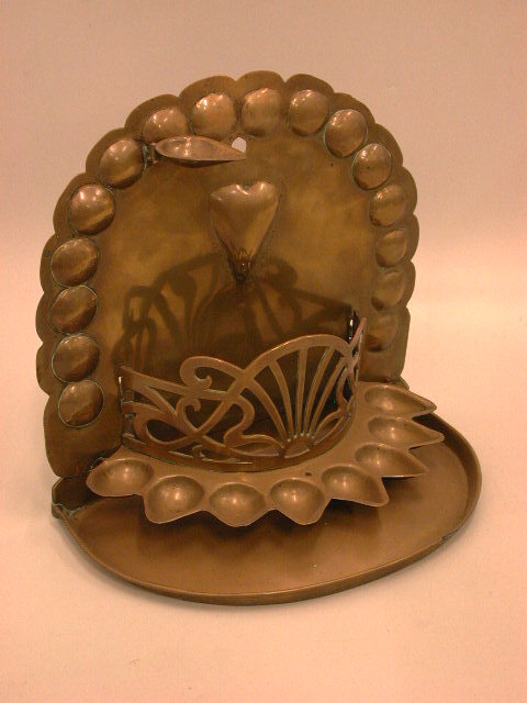 Bestaande uit een rondbogige achterplaat met gelobde rand, waarlangs aaneengesloten opgedreven cirkels, een ophanggat en een in het centrum opgedreven hartvorm, waarschijnlijk een druiventros zonder detaillering? Aan de onderzijde van de achterplaat een met roodkoperen nagels bevestigde halfcirkelvormige druipbak met 1.5 cm. hoge rand. Boven de bak, bevestigd aan de achterplaat, een 10 cm. hoog halfrond "hekwerk" met Jugendstil decoratie, met langs de onderzijde de acht, uit een plaat gedreven druppelvormige oliehouders. Linksboven aan de achterplaat een haakje, waaraan de druppelvormige "knecht" of Sjammos.