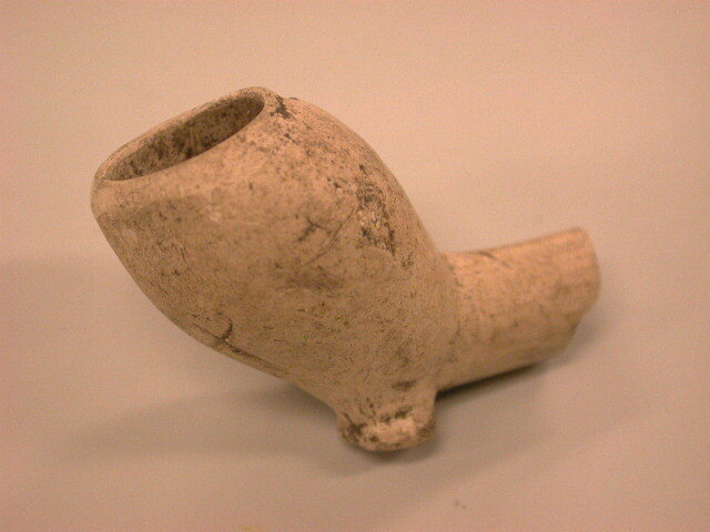 - BeschrijvingWitte pijpekop met op het steunvlakje onder de kop een reliƫfstempeling, vermoedelijk een fabrieksmerk (Franse lelie?, moeilijk te zien)