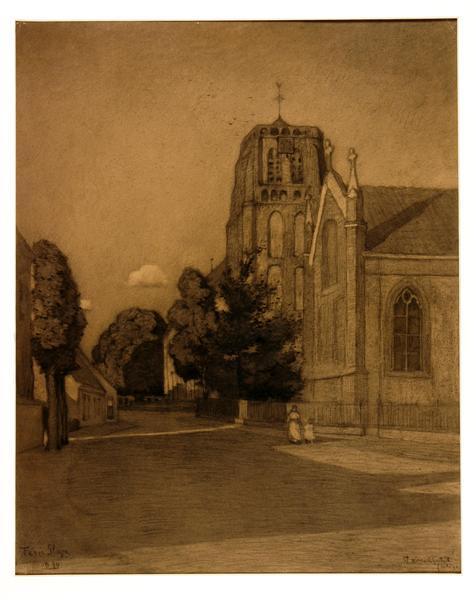 Gezicht op de kerk van Sint Michielsgestel. Op de straat ervoor loopt een vrouw met een kindje aan de hand. Links van de straat enkele lage huisjes met lindebomen ervoor. Ook voor de kerk staan bomen. Naast de kerk staat nog een kerk (de Hervormde?). Rond de kerk is een muurtje gebouwd. R.o.geannoteerd "St.Michiels Gestel/ Juli 99(?)"