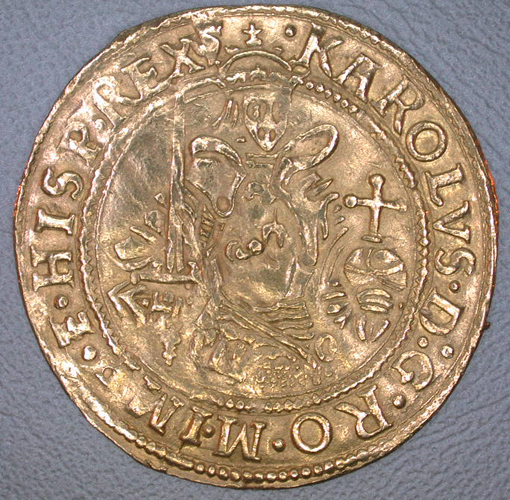 Voorzijde: binnen een parelrand de in harnas geklede, gekroonde keizer ten halven lijve met zwaard en rijksappel; omschrift: +KAROLVS¬‡D‡G‡ROM‡IMPE‡Z‡HISPA‡REX, handje