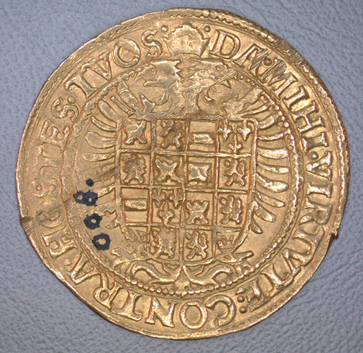 Keerzijde: binnen een parelrand een dubbelkoppige adelaar met het Oostenrijks-Bourgondische wapen voor de borst; omschrift: DA‡MI[]C]HI‡VIRTVTE‡CO[N]TRA‡HO¬ST[E]S ¬‡TV¬OS, kroontje