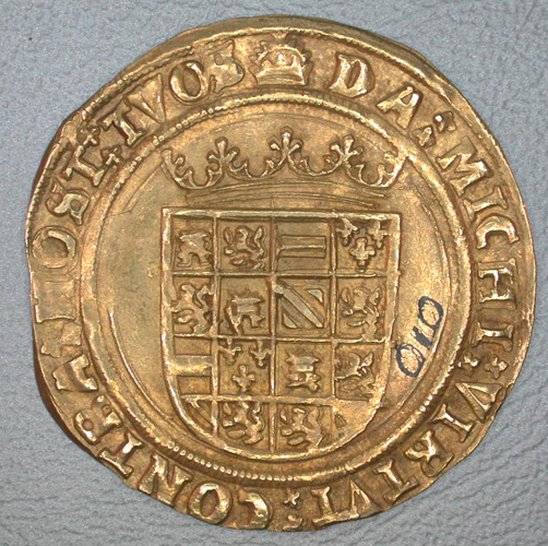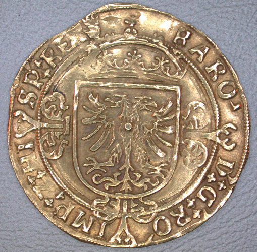 Keerzijde: binnen een parelrand het gekroonde Oostenrijks-Bourgondisch wapen met een omschrift en een kroontje.