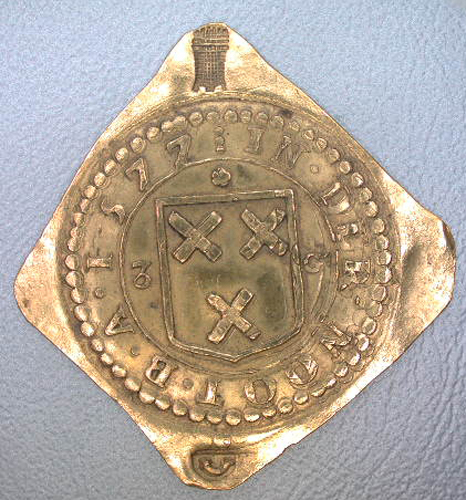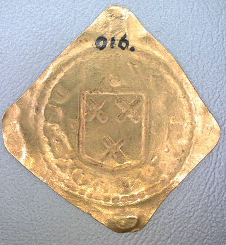 Bredase vierkante gouden noodmunt met ongelijke zijden. Eenzijdig geslagen. Zou geslagen en gebruikt zijn ten tijden van het beleg van Breda van 1577.