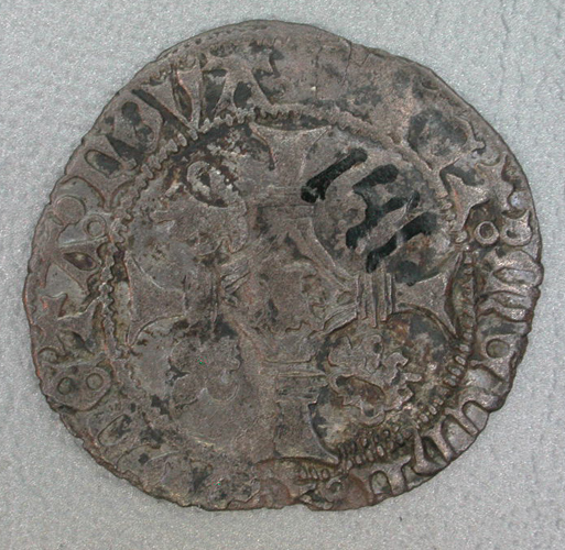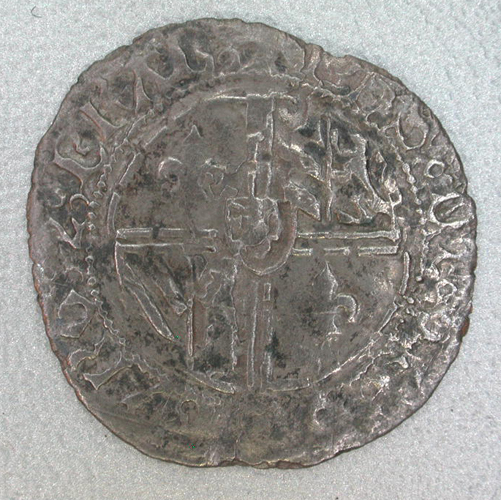 Keerzijde: binnen een parelrand een gevoet kruis met in het hart de Brabantse leeuw, in de kwartieren twee fleurs-de-lis en twee leeuwen; omschrift: +MONETA:NO¬VA:FACT:MEChL: