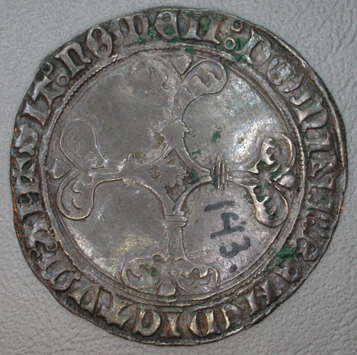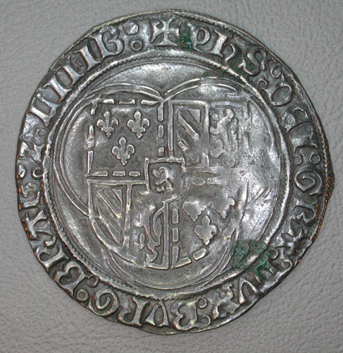 - BeschrijvingVoorzijde: het hertogelijke wapen gevat in een driepas. Tussen twee parelranden het omschrift. Keerzijde: een gebloemd kruis met de Brabantse leeuw in het hart. Tussen twee parelranden het omschrift.