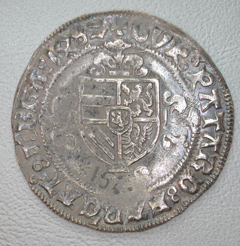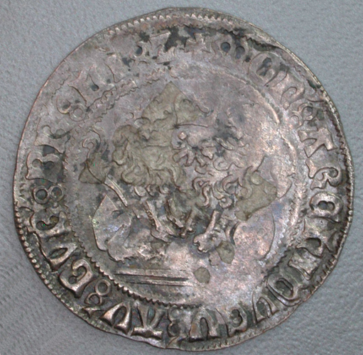 - BeschrijvingVz: Twee naar elkaar toegewende zittende leeuwen. Tussen hen in de Bourgondische vuurslag waaruit vonken opspringen. Tussen twee parelranden het omschrift. Kz: Een gebloemd kruis beladen met het Bourgondische wapen. Tussen twee parelranden het omschrift.