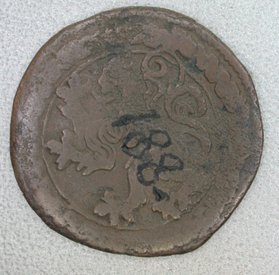 - BeschrijvingVz: Een gekroonde hoofd van Karel V naar rechts. Tussen een getrokken rand en een kabelrand het omschrift. Kz: Een klimmende leeuw binnen een getrokken rand, een kabelrand en een parelrand.