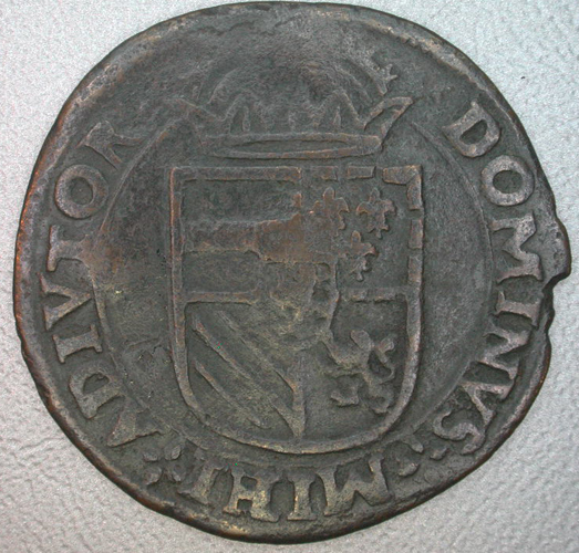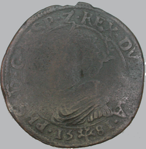 - BeschrijvingVz:binnen een getrokken rand een gekroonde buste naar links, daaronder het jaartal 15 boompje 81; omschrift: PHS.D.G.HISP.Z.REX.DVX.BRA. Kz:binnen een getrokken rand het gekroonde Oostenrijks-Bourgondische wapen; omschrift: .DOMINVS-|-MIHI-|-ADIVTOR.