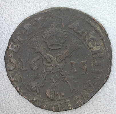 Vz: Het gekroonde wapen van Oostenrijk-Bourgondiƫ beladen met het Brabantse wapen. Tussen een getrokken rand en een parelrand het omschrift. Kz: Een stammenkruis beladen met een vuurstaal waaraan het ordeteken van het Gulden Vlies hangt. In het bovenste kwartier een kroon, links en rechts het jaartal 16-15. Tussen een getrokken rand en een parelrand het omschrift