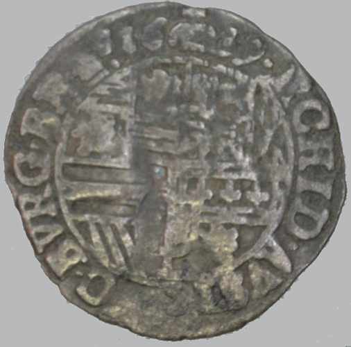 - BeschrijvingVz: gelijk aan de hele stuiver Kz: binnen een getrokken lijn het gehele vlak beslaande aartshertogelijke wapen; omschrift: .ARCHID.AVST.DVC.BVRG.BR.Zc., 16 kopje 19