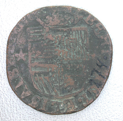 Vz: Het gekroonde aartshertogelijke wapen,geflankeerd door twee vijfpuntige sterren (muntteken van Maastricht). Tussen een getrokken rand en een parelrand het omschrift. Kz: Een stammenkruis beladen met het gekroonde wapen van Maastricht, waaraan het ordeteken van het Gulden Vlies hangt. Ter weerszijden van het wapen het jaartal 16-14. Tussen een getrokken rand en een parelrand het omschrift.