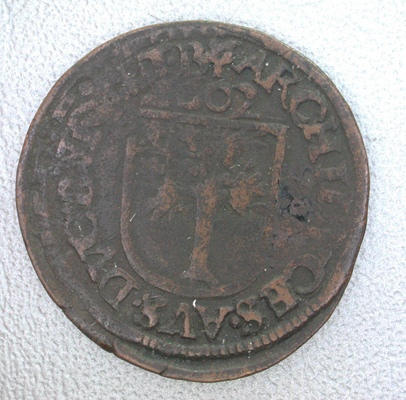 - BeschrijvingVz: Het gekroonde aartshertogelijke wapen. Daaromheen het omschrift en een parelrand. Kz: Het stadswapen van 's-Hertogenbosch met daarboven het jaartal 1602. Om het geheel het omschrift en een parelrand.