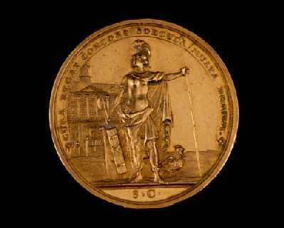 Vz: Staande engel met in de linkerhand een zichzelf in de staart bijtende slang waarin het jaartal 1770, naast de voet van de engel een bloem. Langs de rand een opschrift. In de afsnede: MDCCLXX. Rechtsboven de afsnede: TVB. Kz: Staande Mars in toga, een speer in de linkerhand en een roeispaan en bijlbundel in de rechterhand