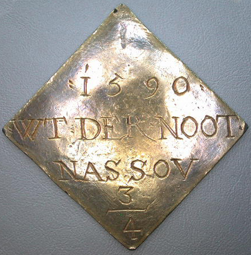 - BeschrijvingVz: Het stadswapen van Breda. Tussen een getrokken rand en een parelrand het omschrift. Daarbuiten de klop met een hoorntje. Kz: Gegraveerd opschrift.