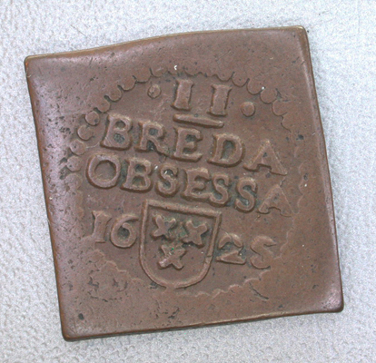 - BeschrijvingRuitvormige munt, eenzijdig gestempeld. Vz: Drieregelig opschrift, daaronder het stadswapen van Breda geflankeerd door het jaartal 16-25. Om het geheel een parelrand. Kz: Blanco.