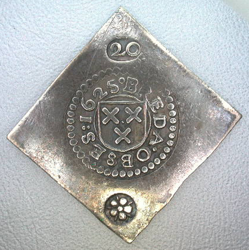 - BeschrijvingRuitvormige munt, eenzijdig gestempeld. Vz: Het stadswapen van Breda. Tussen een getrokken rand en een parelrand het omschrift. Daarbuiten twee kloppen: XX en "roos". Kz: blanco.