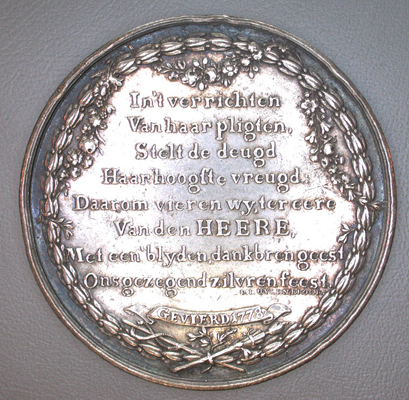 Vz: Een staande en een geknielde vrouw voor een altaar. Aan hun voeten een hoorndes overvloeds achter hen een gedenknaald met het getal XXV. Links op de achtergrond een schip. Boven de voorstelling een opschrift onder de voorstelling een afsnede. Kz: Een door een lauwerkrans omzoomde tekst. Daaronder een banderd.