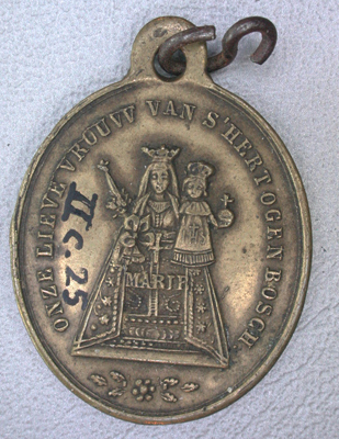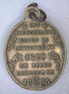 Voorzijde: Het beeld met het opschrift: MARIE op het kleed. Omschrift: ONZE LIEVE VROUW VAN S'HERTOGENBOSCH Keerzijde: Opschrift: DIT/MIRACULEUSE/BEELD IS/ONTVOERD IN/1629/EN TERUG/GEKOMEN IN/18 26/12 53 De tekst is omgeven door bloempjes. Ovale penning, aan de bovenzijde voorzien van een oogje met een ring.