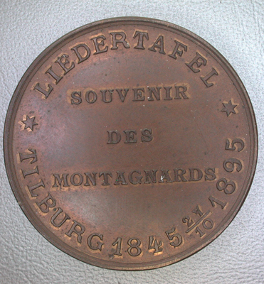 - BeschrijvingVoorzijde: Opschrift: SOUVENIR/DES/MONTAGNARDS. Omschrift: *LIEDERTAFEL*/TILBURG 1845 27/10 1895 Keerzijde: Lauwerkrans rond een blanco veld.