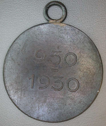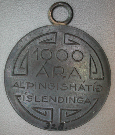 - BeschrijvingRonde penning met aan de bovenzijde een oog. Voorzijde: Tussen vier kwartcirkelvormige, geometrische motieven, het opschrift: 1000 ARA/ALPINGISHATID/ISLENDINGA Keerzijde: Opschrift: 930/-/1930