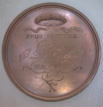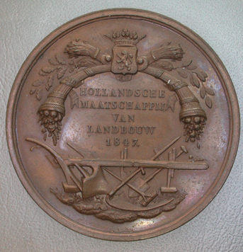 Voorzijde: Twee gekruiste hoornen des overvloeds en twee korenschoven met lauwertakken, daarop het gekroonde wapen van Brabant. Opschrift: HOLLANDSCHE/MMAATSCHAPPIJ.VAN/LANDBOUW/1847 Onder het opschrift diverse landbouwwerktuigen. Keerzijde: Onder een lauwerkrans met linten het gegraveerde opschrift: PRIJS BESTUUR/Ooyen./C.D. Tijssen./HAARLEM./1863.