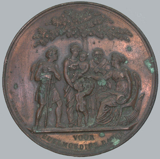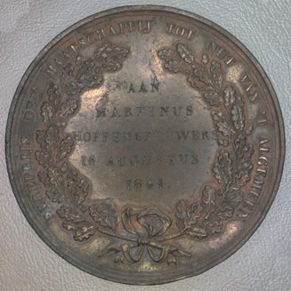 voorzijde: Rechts een zittende vrouwe fortuna, die bloemen geeft aan een kind. Naast haar een kroon des overvloeds. Verder een oude man, een jonge man en een vrouw met een kind op de ank. Op de achtergrond een boom met vruchten. Op de afsnede (gegraveerd): VOOR/EDELMOEDIGE DADEN. keerzijde: Omschrift: EEREPRIJS DER MAATSCHAPPIJ TOT NUT VAN 'T ALGEMEEN. Binnen een lauwkrans het opschrift (gegraveerd): AAN/MARTINUS/HOPPENBROWUERS/ 14 AUGUSTUS/1844