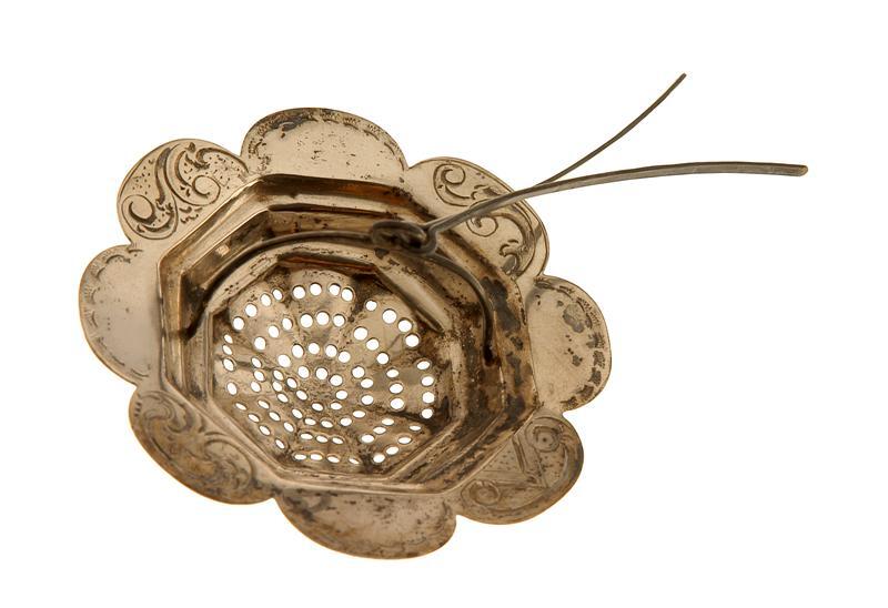 - BeschrijvingZilveren zeefje, rond model. Versierd met acht lobben, afwisselend glad en gegraveerd. Met beugel en tuitveer van latere datum.