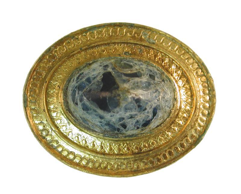 - BeschrijvingFibula. Ovaal. Zeer fraai. In het midden is een groene steen geplaatst. Er omheen is een ring, net als de buitenring, van goudkleurig metaal versierd met een vakkundig aangebracht kruismotief. De buitenring heeft een dito parelmotief. Van de sluiting ontbreekt de naald.
